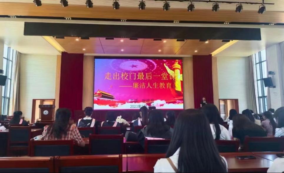 首先,党委副书记张晓晨为毕业生开展廉洁人生教育,从信念廉洁、遵纪守法、诚信感恩、勤俭节约、知足常乐五个方面启示毕业生去践行廉洁,去做有理想、敢担当、能吃苦、肯奋斗的新时代好青年。