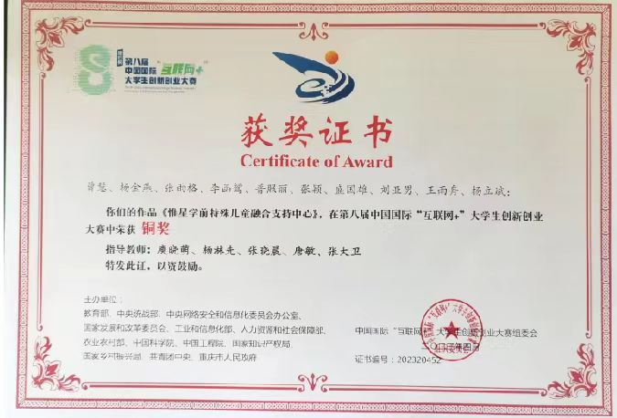 近日,公司“惟星学前特殊儿童融合支持中心”项目团队在第八届“互联网+”创新创业大赛中荣获国家级铜奖!团队致力于成为中国学前特殊儿童融合支持的引领者,用创新思维和实际行动为特殊儿童的成长和发展贡献力量。