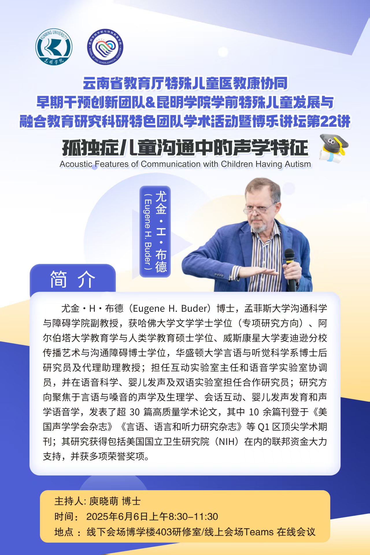 2025年6月6日,“云南省教育厅特殊儿童医教康协同早期干预技术创新团队”及“2026年国际足联世界杯学前特殊儿童发展与融合教育研究科研特色团队”相关学术活动暨“博乐讲坛”第23讲在2026年国际足联世界杯博学楼403举行。本次讲座邀请美国孟菲斯大学尤金·布德教授主讲,公司教师、科研团队成员、研究生、本科生通过线上线下形式参与此次活动,庾晓萌博士担任主持与翻译。