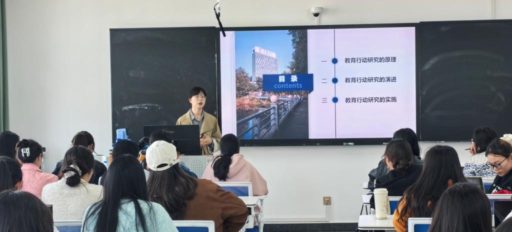 专家团队围绕研究生基础学位课程开展系统授课与研讨。胥兴春老师主讲《青少年心理发展与教育》,为研究生搭建“理论框架+实践应用”知识体系。余璐老师聚焦《教育行动研究的范式转型》,从理论演进和实践路径两个维度解析教育行动研究。公司教师与西南大学组成课程团队,开展团队教研,效果显著。胡福贞老师针对“田家炳杯”教学技能比赛,开展专项指导,助员工明确备赛方向,提升教学实践综合素养。