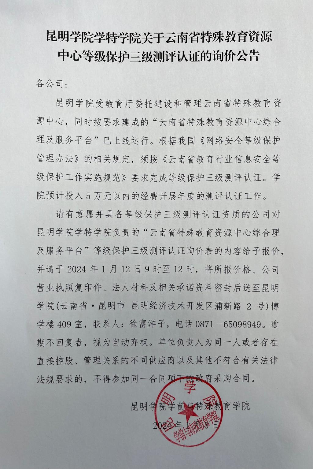 云南省特殊教育资源中心综合管理与服务平台等保三级测评采购询价公告.docx