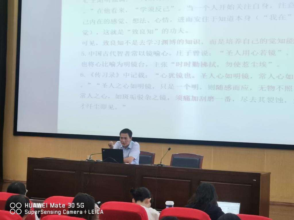 讲座中,谢青松教授以“后羿射日”的故事导入,从“圣人之心如明镜,常人之心如昏镜;须是大哭一番方乐,不哭便不乐;教育就是唤醒‘吾心之良知’”三个问题进行讲述和分析,并结合师范教育培养未来教师的实际,指出师范教育应以关注员工心的成长发展,鼓励员工通过宣泄的方式,及时消除情绪的垃圾,让心恢复其本来就有的纯净。